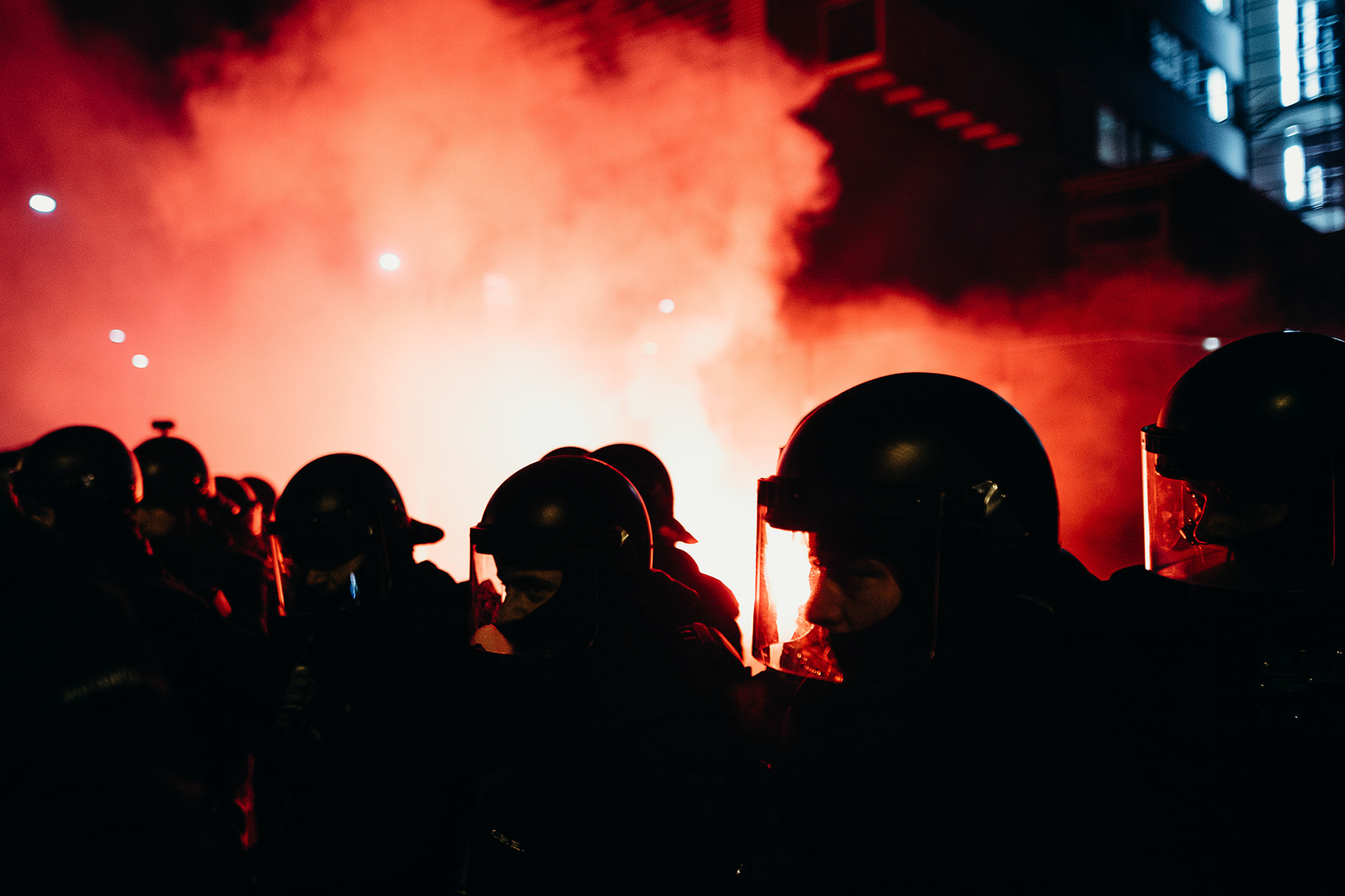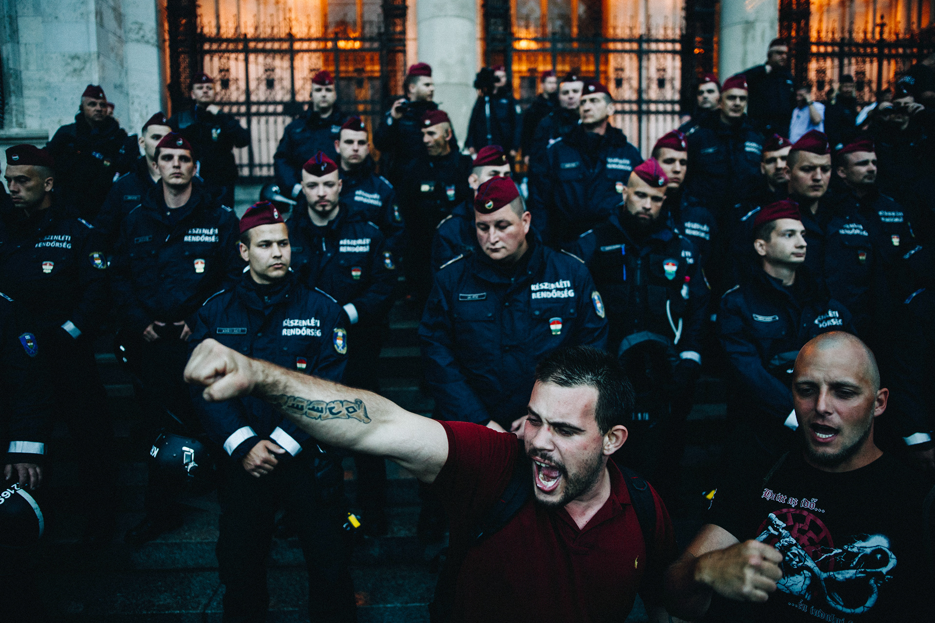 Queue of riot police officers at the MTVA headquarters in Budapest, during a demonstration against the overtime law, December 17, 2018.