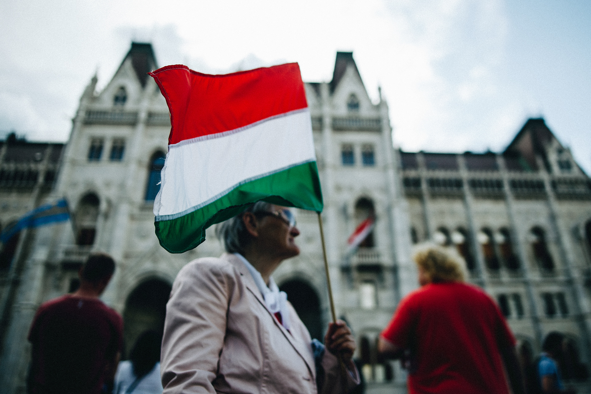 Participant in front of the hungarian Parliament building on a demonstration in Budapest, after Fidesz won a two-thirds parliamentary majority for the second time in the parliamentary elections on May 8, 2018.