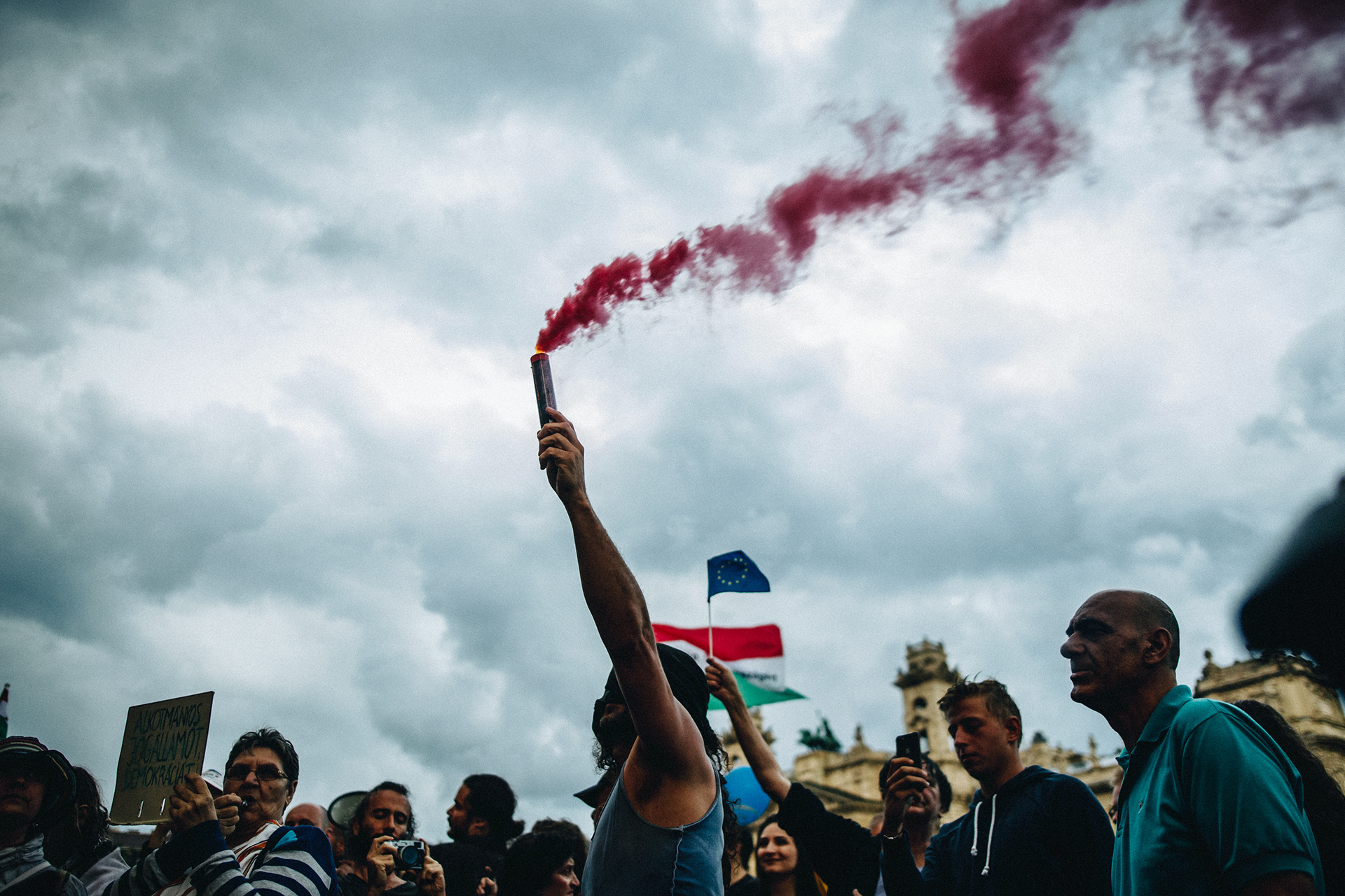 Participant holds a smoke flare in front of the hungarian Parliament building on a demonstration in Budapest, after Fidesz won a two-thirds parliamentary majority for the second time in the parliamentary elections on May 8, 2018.