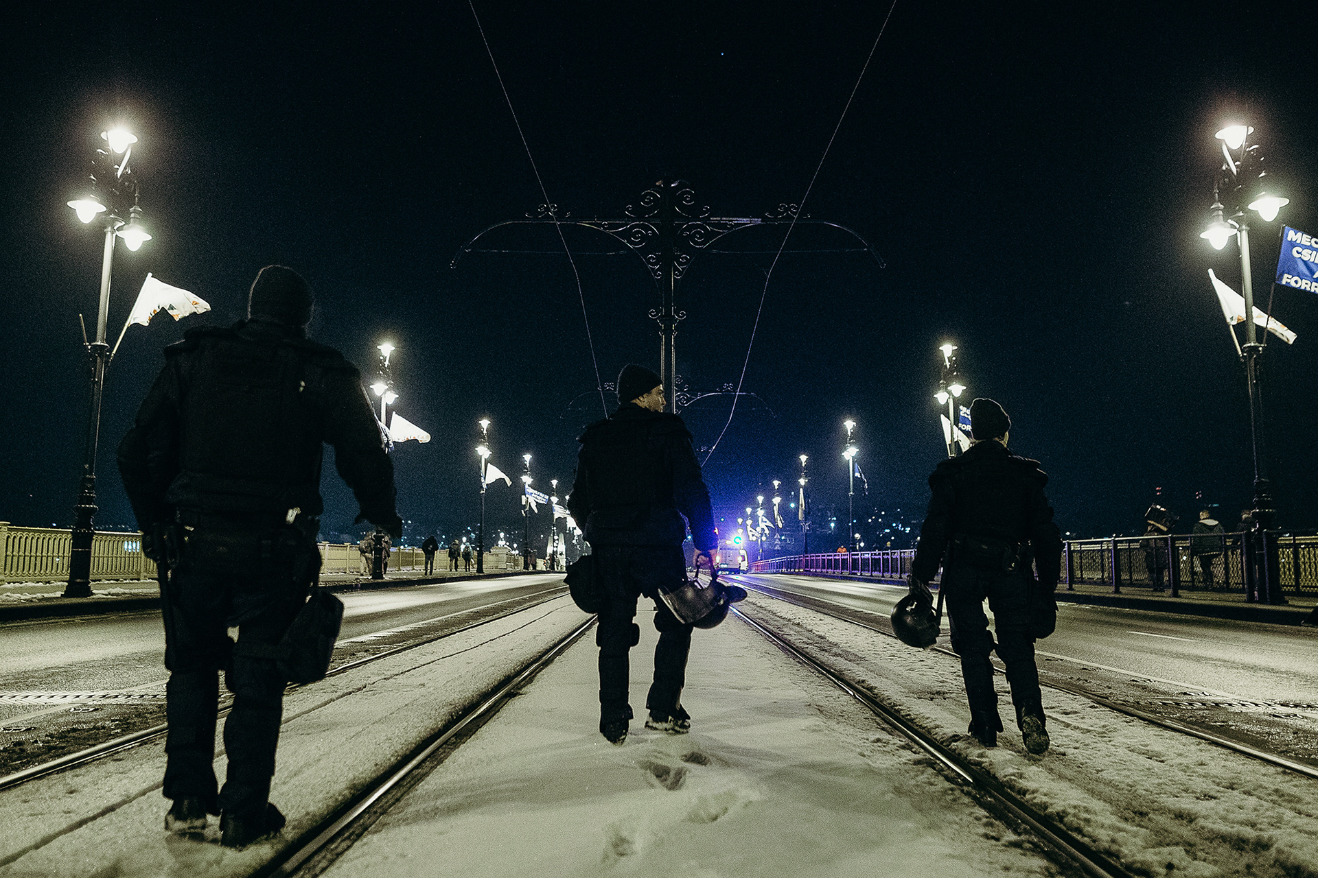 Riot police march on Margaret Bridge in Budapest on an anti-government demonstration against the overtime law on December 17, 2018.